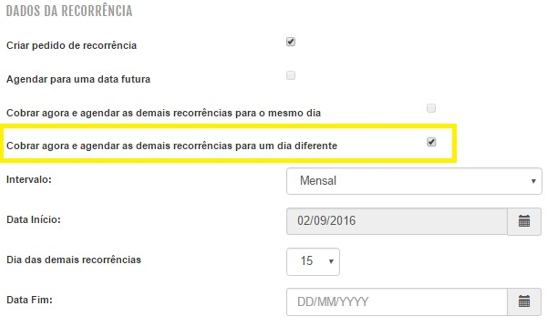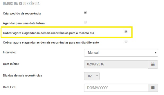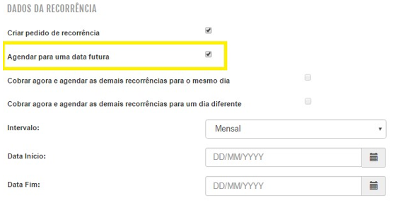 In this option, the recurrency will be scheduled accordint to the informations provided below. In this case, the customer will be charged just when the first recurrency occurs (start date).